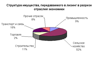 В разрезе секторов экономики, с которыми работают лизинговые компании преобладает сельское хозяйство (52% от всего объема лизинга) , что связано с деятельностью государственной лизинговой компании «Казагрофинанс». Необходимо отметить, что интерес коммерческих лизинговых компаний к сельскому хозяйству также возрос. Из 80 млн. долларов, вложенных в сельское хозяйство почти 53% приходится на их долю. Коммерческие лизинговые компании также предпочитают работать в транспортной отрасли и строительстве, на долю которых приходится соотвественно 18% и 11% всего рынка лизинга.