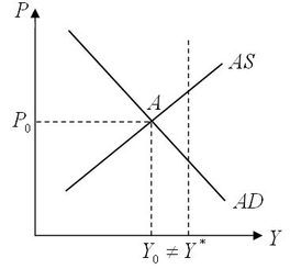 Кейнсианская экономическая теория оспаривает существование такого механизма саморегулирования. На основе эмпирических данных, полученных в период Великой Депрессии, Д. Кейнсу удалось доказать, что полная занятость в нерегулируемой экономике может возникнуть только случайно. Равновесие спроса и предложения (рис. 2.1), как правило, не совпадает с полной занятостью ресурсов: в точке