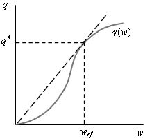 По мере повышения цены труда его производительность сначала увеличивается растущими темпами (действуют физиологические и психологические стимулы), а затем замедляющимися (действуют только психологические стимулы). Эффективная ставка реальной зарплаты определяется точкой касания кривой производительности труда с лучом, исходящим из начала координат. В этой точке