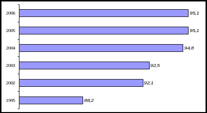 Анализ удельного веса крестьянских (фермерских) хозяйств в общем количестве сельхозформирований показывает, что их доля неуклонно возрастает. Как видно из рисунка 1 в 1995 году доля крестьянских (фермерских) хозяйств составила 88,2%, а в 2001 году - 91,6 % из общего количества сельхозформирований области, в 2006 году - 95,1%. В 2005 и 2006 году стабилизировался рост количества крестьянских (фермерских) хозяйств.