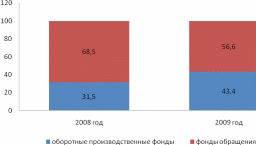 Низкий показатель денежных средств в кассе и на расчетном счете предприятия объясняется тем, что ООО «РМЗ-НКНХ» является структурным подразделением ОАО «Верхнекамскнефтехим» и вся реализация нефти идет через недавно созданное управление по реализации нефти, поэтому выручка от реализации продукции очень мала, а следовательно, объясняет столь малую сумму денежных средств в кассе. Соотношение оборотных производственных фондов и фондов обращения в ООО «РМЗ-НКНХ» в 2008-2009 гг. можно наблюдать на рисунке 2.1.