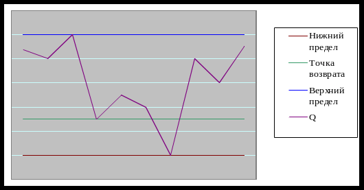 Логика действий финансового менеджера по управлению остатком средств на расчетном счете представлена на рис. 3 и заключается в следующем. Остаток средств на счете хаотически меняется до тех пор, пока не достигает верхнего предела. Как только это происходит, предприятие начинает скупать достаточное количество ликвидных ценных бумаг с целью вернуть запас денежных средств к некоторому нормальному уровню (точке возврата). Если запас денежных средств достигает нижнего предела, то в этом случае предприятие продает накопленные ранее ценные бумаги и таким образом пополняет запас денежных средств до нормального предела.