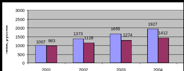 Как видно из рисунка Г.1 в городе наблюдается постоянное увеличение количества пенсионеров, а также среднего размера пенсии. Однако, если сравнивать размер пенсии с прожиточным минимумом, то можно заметить, что размер пенсии недостаточен для нормального существования среднестатистического Нижнекамского пенсионера. Однако, все же наблюдается тенденция в сторону превышения размера пенсии над прожиточным минимумом (рисунок 4) [67,68,69,70,71,72].