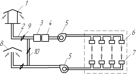 1 – устройство для забора воздуха; 2 – воздуховод; 3 – фильтр; 4 – калорифер; 5 – центробежный вентилятор; 6 и 7 – приточные и вытяжные насадки; 8 – устройство для удаления воздуха; 9 – вентиль; 10 – соединительный воздуховод.