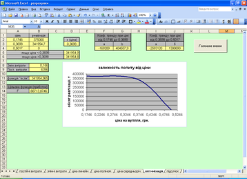 Натиснувши на кнопку "Оптимізація" користувач інформаційної системи має змогу потрапити на лист, на якому приведена модель по максимізації прибутку за рахунок збільшення ціни. Ця частина інформаційної системи наведена на нижче на рисунку 3.4.