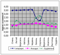 Сезонність попиту характерна тільки для будівельних фарб (рисунок 2.4). Досвід ряду компаній показує, що в грудні попит на 10-20% нижче середньомісячного рівня, у січні - на всі 40%, а влітку (липень-серпень) на 20-30% вище. Однак і тут є особливості кон'юнктури ринку. Наприклад, фасадні фарби починають купувати навесні, і більш-менш стійкий попит існує до осені. Интерьерные фарби (особливо воднодисперсійні) користаються попитом весь рік, і різкий спад відбувається тільки в другій половині літа в сезон масових відпусток.