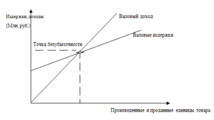 Суть метода - в поиске точки нулевой прибыли, или точки безубыточности (рис 3.1), которая означает, что валовой доход от продаж фирмы равен ее валовым издержкам. То есть нужно определить такой минимальный объем продаж, начиная с которого фирма не несет убытков. При этом издержки фирмы равны ее доходам.