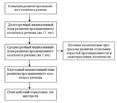 Для эффективного формирования промышленной политики все ее составляющие должны органически увязываться посредством индикативного плана развития промышленного комплекса региона, являющегося частью индикативного плана социально-экономического развития региона. Индикативный план должен составляться на год, пять и пятнадцать лет. Министерству экономики необходимо постепенно перейти на новую систему планово-прогностических документов. В соответствии с ней система плановых документов по управлению промышленным комплексом региона должна иметь следующие составляющие (рис. 3.3).