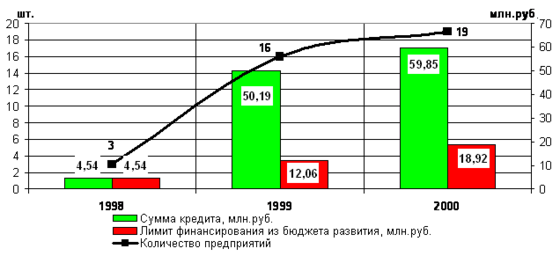 | Год | Количество предприятий | Сумма кредита, млн.руб. | Лимит финансирования из бюджета развития, млн.руб. |