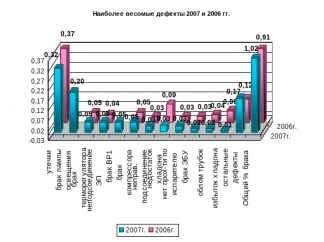 В 2007 г. по всем наиболее весомым дефектам по сравнению с 2006г. (за исключением дефекта «неподсоединение ЭП») процент брака либо не изменился, либо снизился. Наибольшее снижение составило 0,06% («нет проходимости по испарителю»), 0,05% по «утечке хладона». Однако по проценту «остальных дефектов» произошло увеличение показателя на 0,05%, что повлияло на общее увеличение уровня отказов.