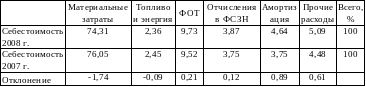В структуре себестоимости наибольший удельный вес составляют материальные затраты. Общий рост материальных затрат, без учета топливно-энергетических ресурсов, к 2007 г. в абсолютных цифрах составил 55 971 млн. р. По элементам в себестоимости в 2008 г. удельный вес материальных затрат снизился на 1,74%, топлива и энергии на 0,09%. Наибольшее увеличение произошло за счет амортизации на 0,89% и прочим расходам на 0,61%.