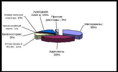 Как следует из рис. 2.7, основная доля затрат в структуре себестоимости столярного участка ложится на заработную плату – 33% и отчисления на заработную плату – 12%. Удельный вес материалов в структуре себестоимости, порядка 35%. Остальные статьи калькуляции занимают меньшую долю затрат в структуре себестоимости, арендная плата и коммунальные платежи -15% Незначительный удельный вес составляют прочие расходы, порядка 3%.
