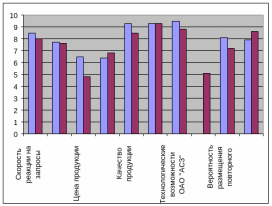 Анализируя данные рисунка 4.6, можно сделать вывод о том, что оценка потребителем эффективности деятельности ОАО «АСЗ» в целом несколько снизились, выше стали оцениваться лишь показатели – срок изготовления продукции, надежность ОАО «АСЗ». Значительно ниже потребитель оценил цену продукции ОАО «АСЗ».