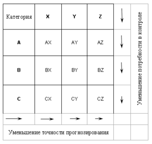 Наложением результатов XYZ-анализа на данные ABC-метода получаем 9 групп ресурсов, для каждой из которых менеджеры фирмы должны разработать свои техники управления блоков, каждый из которых имеет две характеристики: стоимость запасов и точность прогнозирования потребности в них.