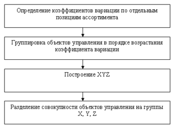 XYZ-анализ позволяет классифицировать запасы, рассмотренные при проведении АВС-анализа, в зависимости от характера их потребления и точности прогнозирования изменений в их потребности, что особенно важно для торговых фирм. Группировка ресурсов при проведении XYZ-анализа осуществляется в порядке возрастания коэффициента вариации.