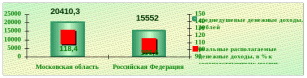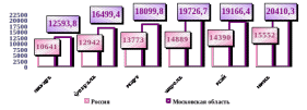 Рис. 2.15 – Денежные доходы на душу населения в Российской Федерации и Московской области в 2008 году, рублей