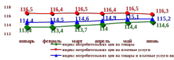 Индекс цен на платные услуги за период январь-июнь 2008 года составил 116,3% к соответствующему периоду 2007 года, на товары – 114,6%, индекс потребительских цен в целом – 115,2%. Справочно: в январе–июне 2007 года по сравнению с январем-июнем 2006 года удорожание услуг и товаров составило 11,5%, 4,9% и 6,8% соответственно.