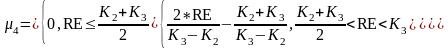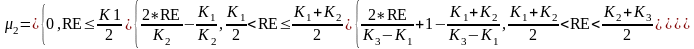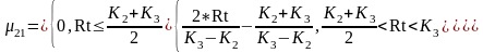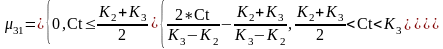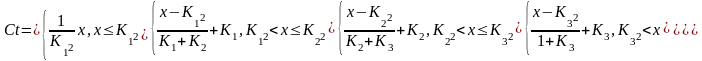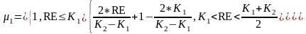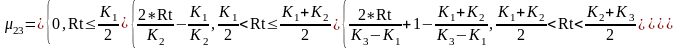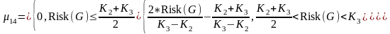 Опишем функции принадлежности к риску для критерия ликвидности. Тут тоже используются границы интервалов для соответствующих уровней риска К1, К2, К3. Где К1 – это граница недопустимого уровня риска, К2 – критического, К3 – повышенного, границей минимального уровня является единица. Значения данных интервалов можно получить из экспертного опроса.