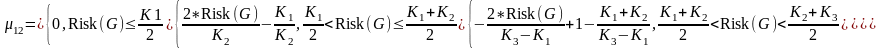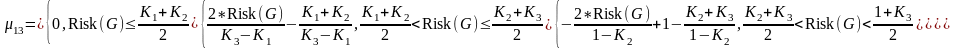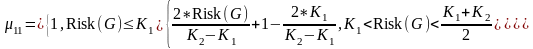 Опишем сформированные функции принадлежности для первого критерия оценки риска. Здесь К1, К2, К3 – границы интервалов для соответствующих уровней риска. Границей для недопустимого уровня является единица. Значения данных интервалов можно получить из экспертного опроса.