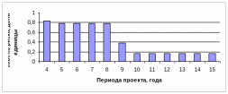 Как видно из рисунка уровень риска на десятом году жизни проекта становится минимальным. Это объясняется тем что с этого года по плану предприятие полностью закончит отдачу долгов по кредиту, то есть соотношение собственных средств к заемным будет на уровне минимального риска, а вероятность того, что чистый приведенной эффект будет меньше заданного уровня эффективности будет близка к нулю. То что уровень риска падает с течением времени говорит о правильности выбранных методов по снижению риска. При этом данные оценки не опираются на субъективные мнения эксперта. Поскольку он только определяет границы рисков, но не затрагивает при этом прогнозы о состоянии среды в будущем.