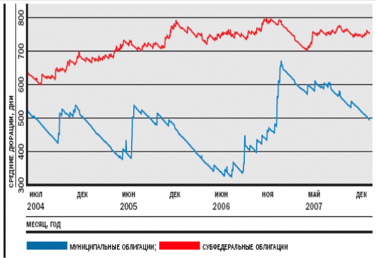 Средняя дюрация муниципальных облигаций характеризуется значительной волатильностью, за год она снизилась с 650 до 500 дней.