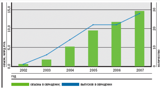 Среди эмитентов в 2008 г. минимальный объем займа был у Электростали и Благовещенска — 150 млн руб., максимальный — у Московской области — 16 млрд руб. (в 107 раз больше). Средний объем 1 выпуска равен 1,8 млрд руб., без учета Московской области — 1,3 млрд руб.
