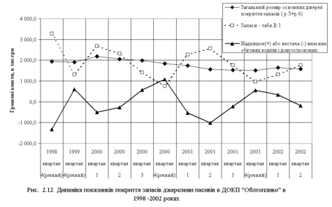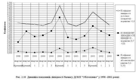 поточна термінова ліквідність (покриття запозичених засобів) перекриває норматив (>1,0) у 1,52,5 рази через незастосування фінансових важелів довгострокових і короткострокових кредитів, але абсолютна ліквідність не відповідає нормі (0,20,3), а фактично в декілька разів нижче, тобто в підприємства хронічна нестача оперативних коштів. Причина за аналізом фінансової стійкості – невідповідність запасів і коштів їхнього покриття (проблеми з реалізацією готової продукції) та високий рівень дебіторської заборгованості за авансом відпущене паливо.