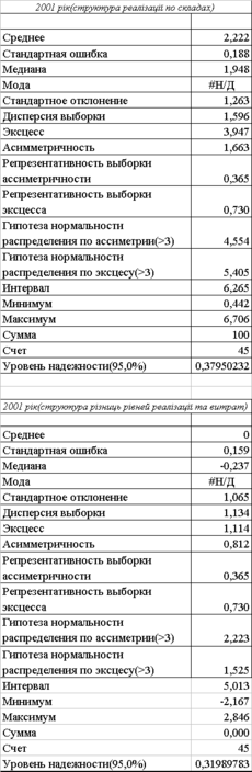 Таблиця 3.4 - Характеристики розрахунків кореляції між процентом реалізації та різницею проценту реалізації та проценту витрат по складах ДОКП „ОБЛПАЛИВО” в 2001 році