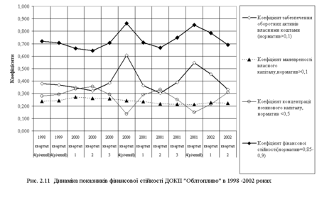 У той же час, як видно за результатами розрахунків відносних показників фінансової стійкості, положення ДОКП «ОБЛПАЛИВО» – досить стійке, оскільки основними ресурсами капіталу підприємства є власні засоби, що складають біля 70,0 % валюти пасивів балансу. При цьому слід зауважити, що практично 70% капіталу ДОКП “ОБЛПАЛИВО” вкладений в основні засоби (імобілізовані) і тільки 30% капіталу вкладені в оборотні фонди підприємства.