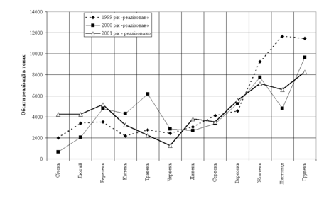 Рис.3.2 Порівняльна помісячна динаміка реалізації вугілля ДОКП “Облпаливо” в 1999 – 2001 роках