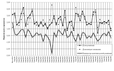 Як видно з результатів розрахунків – кореляційний зв‘язок між рівнем процентної долі реалізації складу у загальному обсязі реалізації складів Х та результативним агрегатом ефективності роботи складу Y (різниця між процентною долею реалізації та процентною долею витрат складу у загальних витратах) – прямий, значимий середньої щільності(57% результатів по показнику R2 пояснюються рамками лінійної моделі).
