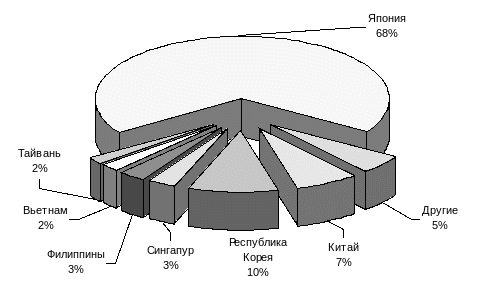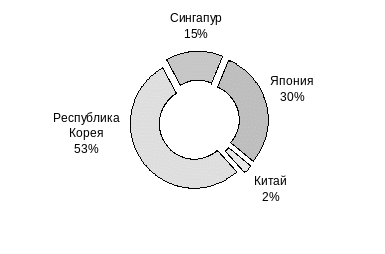 Среди иностранных инвесторов в 1998 г. лидирующее положение занимали Республика Корея и Япония на которые приходилось соответственно 53% и 30% от общего объема иностранных капиталовложений (см. рис.4.2).
