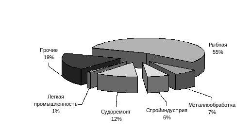 В структуре промышленного производства сложилась следующая ситуация. Удельный вес рыбной отрасли уменьшился с 67% (1990 г) до 55% (1999 г) (см. рис.4.1).