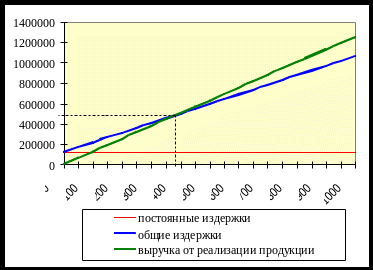 Данные, полученные при расчетах, можно определить и графическим методом (см. рисунок 3.2). Для этого строим прямую выручки от реализации продукции, прямую постоянных издержек и прямую общих издержек. Пересечение линии выручки и линии общих издержек и есть точка критического объема выпуска продукции. Значение в натуральных единицах определяется на оси абсцисс, в стоимостном – на оси ординат.