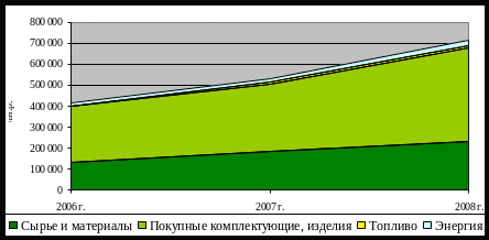 Рисунок 2.4 – Структура и динамика материальных затрат на производство продукции ПО «БелАЗ» в 2006-2008 гг.