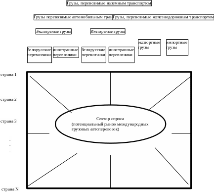 -грузы, перевозимые и железнодорожным, и автомобильным транспортом. В данном разделе рассматриваются перевозки товаров, входящих во вторую группу. Грузы, перевозимые и автомобильным, и железнодорожным транспортом, образуют сегмент сектора спроса, определяемый здесь как потенциальный рынок грузоперевозок для автомобильных перевозчиков.Предлагаемый способ структуризации потенциального рынка грузовых автоперевозок иллюстрируется рисунком 2.1. В потенциальном рынке выделяется та его часть, которая фактически освоена автоперевозчиками, а в ней выделяется доля, принадлежащая белорусским перевозчикам. При этом отдельной оценке подлежат экспортируемые и импортируемые грузы. Потенциальный рынок международных грузовых автоперевозок рассматривается, кроме того, как сумма рынков, образуемых международным товарообменом Беларуси со странами-экспортерами и странами-импортерами. Таким образом, сектор спроса на международные грузовые автоперевозки структурируется в двух измерениях. Одно из них задается при рассмотрении конкурирующих групп перевозчиков - железнодорожный транспорт, белорусские и иностранные грузовые автоперевозчики. Второе измерение вводится путем разбиения сектора спроса на сегменты для каждой страны - участника товарообмена с Республикой Беларусь. Проведенное описанным способом структурирование сектора спроса на международные грузовые автоперевозки создает основу для последующего анализа занимаемых на нем позиций белорусских и зарубежных грузовых автоперевозчиков.