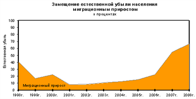 Сокращение численности населения происходило из-за естественной убыли населения, которая в 2008 г. уменьшилась по сравнению с 2007 г. на 106,8 тыс.человек. Увеличившийся миграционный прирост на 66,6% компенсировал численные потери населения.