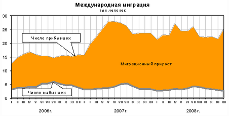 За 2008 г. число мигрантов внутри России сократилось на 63,7 тыс.человек, или на 3,2% по сравнению с предыдущим годом. Миграционный прирост населения России увеличился на 2,2 тыс.человек, или на 0,9%, что произошло в результате сокращения числа снявшихся с регистрационного учета выбывших за пределы Российской Федерации (на 7,5 тыс.человек, или на 16,0%), в том числе за счет эмигрантов в государства-участники СНГ — на 5,3 тыс.человек, или на 16,9%, в страны дальнего зарубежья — на 2,2 тыс.человек, или на 14,1%.
