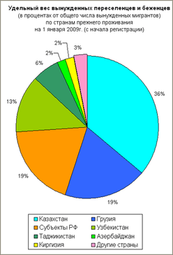 По данным ФМС России, на 1 января 2009 г. в стране насчитывалось 67,2 тыс. вынужденных переселенцев и беженцев. Около 36% из них (23,9 тыс.) составляли бывшие жители Казахстана, 19% (12,8 тыс.) — Грузии, 13% (8,6 тыс.) — Узбекистана, 6% (4,2 тыс.) — Таджикистана. Более 12 тыс. человек (19%) переселились внутри России из регионов с нестабильной общественно-политической обстановкой.