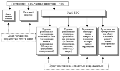 Предполагается, что каждая из вертикально интегрированных региональных АО-энерго будет разделена на ряд компаний сопоставимого размера: генерирующую компанию, распределительную компанию, сбытовую компанию, ремонтную компанию, компанию по управлению непрофильными активами и т.д.