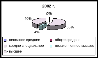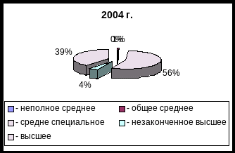 | 3. Образовательный состав | Видим, что основную долю персонала занимают работники со средним специальным образованием (за два года их доля выросла с 55 до 56%). Другую наиболее весомую долю занимают работники с высшим образованием, хотя их доля несколько снизилась. |