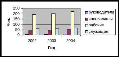 | 1. Структура персонала по категориям | Как видно из рисунка, численность персонала увеличивается по всем категориям. Однако темп роста наиболее высок в категории рабочих. Это связано с введением в действие новой производственной лини (на базе «ЕМК»). Стабильный темп прироста наблюдается в категории специалистов и служащих. |