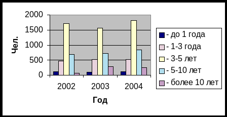 | 2. Структура по полу | В структуре по полу наблюдаем примерно одинаковое распределение персонала: мужчин и женщин. Численность женщин немного превышает численность мужчин, однако к 2004 году есть тенденция выравнивания и этого различия. |
