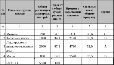 Воспользовавшись следующей таблицей, продифференцировали товарные запасы по методу АВС.