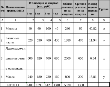 Нужно отметить, что при проведении анализа были учтены: поквартальный объем реализации номенклатурных позиций в стоимостном выражении и процент к общей сумме реализации. И не было уделено внимание таким показателям как: дефицитность номенклатурной позиции, требования к хранению номенклатурной позиции (специальные требования к температурному режиму, влажности), срок хранения, издержки вследствие отсутствия номенклатурной позиции на складе в требуемый момент времени.