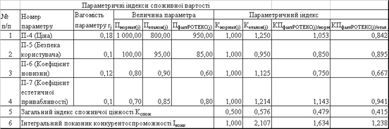 Параметричні індекси споживчої цінності для ТОВ „ДКБ „РОТЕКС”