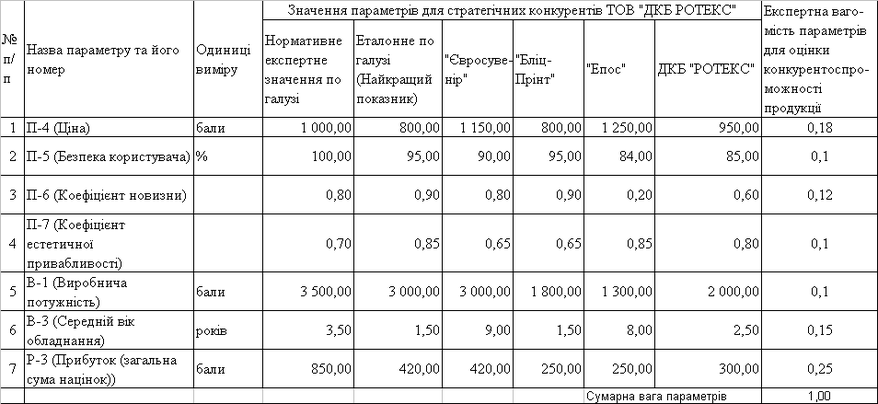 В табл. 2.3 наведені вихідні данні для розрахунку конкурентоспроможності продукції та підприємства ТОВ „ДКБ „РОТЕКС”. В табл.2.3 з табл..2.2 занесені параметри тільки для тих показників, відносно яких експертна вагомість для ТОВ „ДКБ „РОТЕКС” не дорівнює 0.