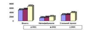 Одержані в результаті аналізу дані за період з 2001 по 2003 рр. свідчать про зростаючий об'єм експорту металопродукції з України: за три роки він виріс на 35% або на 1750 млн. дол. США. У структурі експорту спостерігалося переважання експорту сталевого прокату. За 2001 і 2002 рр. його об'єм збільшився трохи — на 0,7%, проте, в 2003 р. у зв'язку із зростанням цін на сталевий готовий прокат на світових ринках, валютні надходження від його реалізації виросли на 31 % або на 878 млн. дол. США.