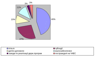 По статті "Пільги" фактична чисельність охоплених соціальними видатками як видно з рис.2.5 займає в загальному обсязі чисельності по району і складає за 2006 рік - 46%, за 2007 рік – 30 %. Чисельність знизилась на 947 чоловік, в тому числі по ветеранам війни та праці на 475 чоловіка в 2007 році. Це пояснюється прийняттям в 2007 році Закону України "Про державний бюджет 2007 року", статті 60 о пільгах ветеранам війни та праці. Згідно цього закону пільги на ветеранів війни та праці, які раніше поширювалися на сім'ю пільговика, стали нараховуватися тільки на одного одержувача пільг.