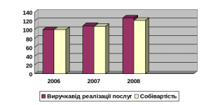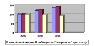 На рис. 2.2.5. наведено динаміку цих показників, а також витрати на 1 грн наданих послуг за 2006-2008 рр.